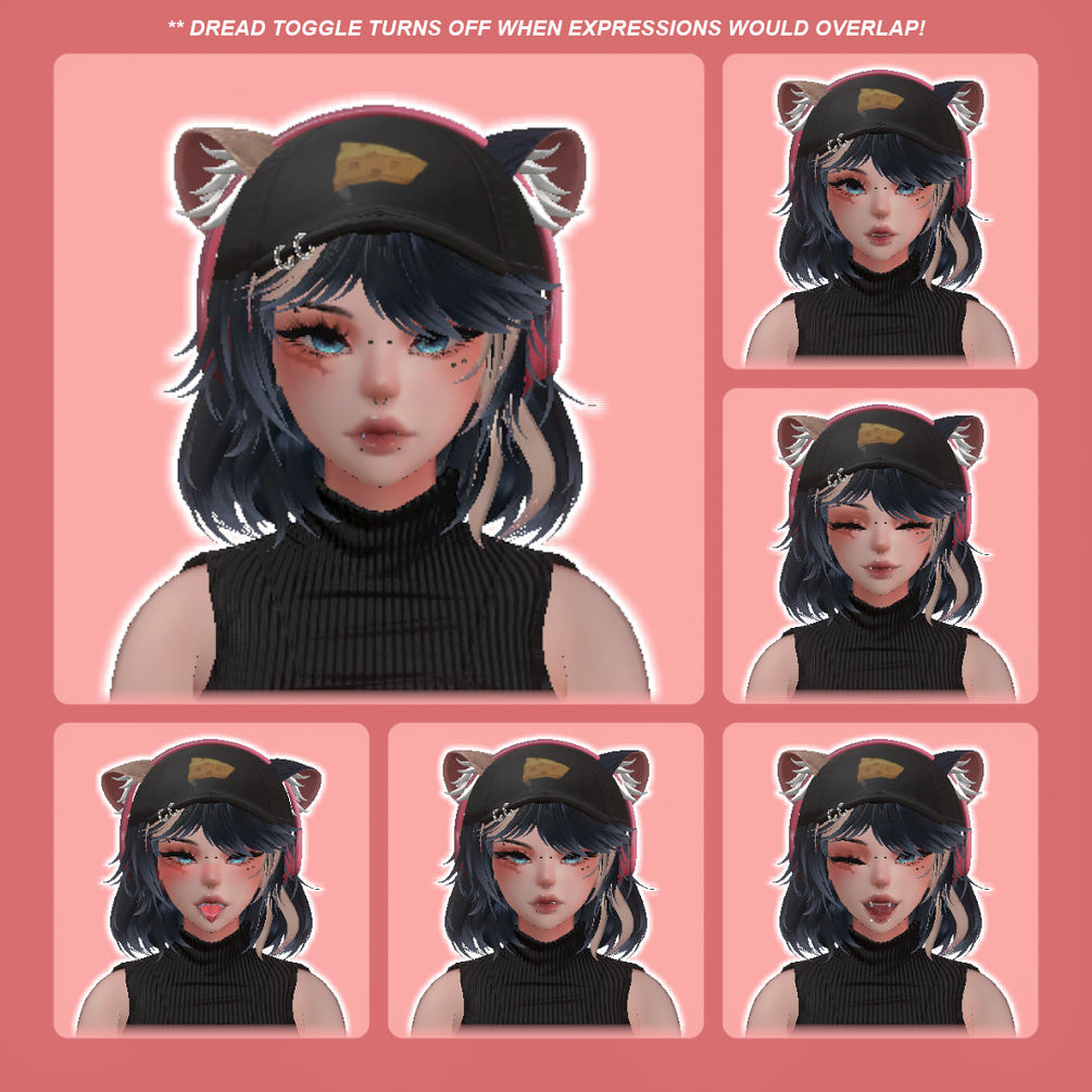 - misc: breath toggle, face shadow toggle ( auto turns off with some gestures that would overlap ), ear fur toggle, ear size radial, contacts toggle on/off.