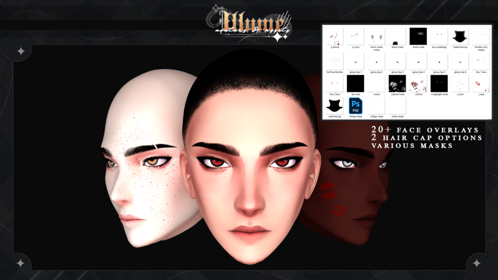 - 20 Overlays for the head including : anime scars, realistic scars, black cheek marks, white cheek marks, black sclera, under eye-bags, freckles only on the cheeks, full face freckles, six glossy lip options, 2 kiss face options, moles, anime / cartoon blood, a more realistic blood splatter, face slap, vitiligo mask with included PSD, mask for blush, lip & highlight.