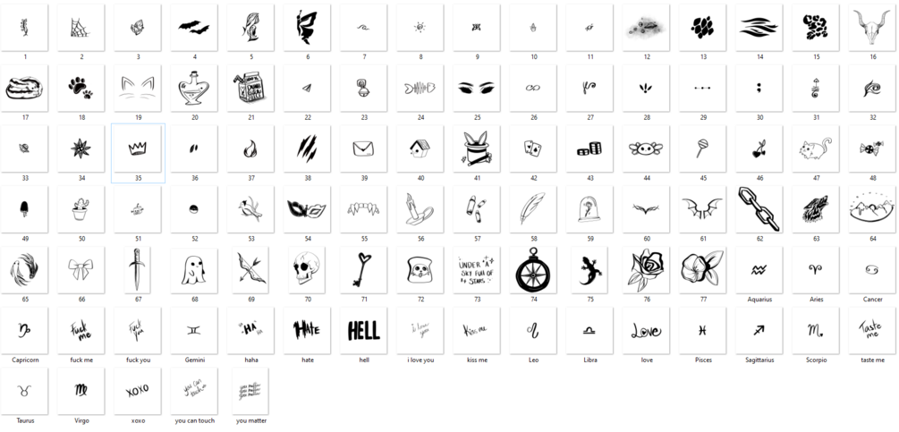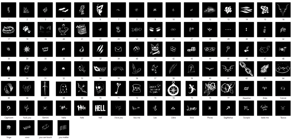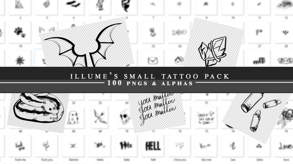 100 small tattoos & alphas --- completely drawn by me in procreate, pngs converted to alphas in photoshop.