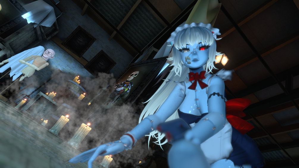 both hairs, headband, dress, choker, cuffs, thigh highs, shoes, spray bottle, feather duster, monster teeth, eyeballs, body texture, bone, textures & edits by me, illume#2788.